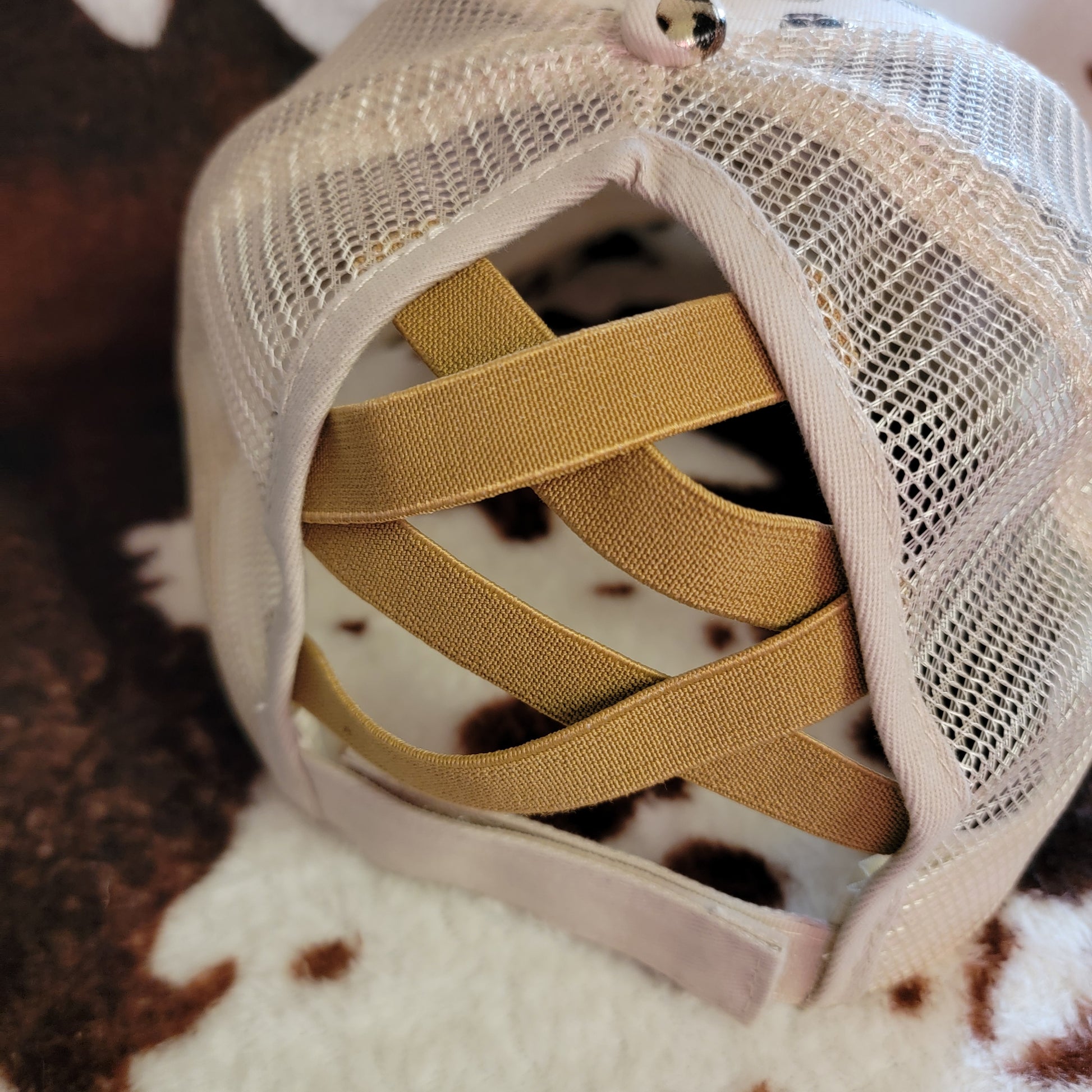 This hat is perfect for high ponytails and messy mom buns! Get ready for a flood of compliments! Stand out in the crowd with the visually appealing crisscross ponytail hat. T Each hat is one-of-a-kind and may vary slightly in appearance, adding to its charm. The elastic closure ensures a comfortable and adjustable fit. Made of 65% cotton and 35% polyester, this hat's material is sure to impress.
