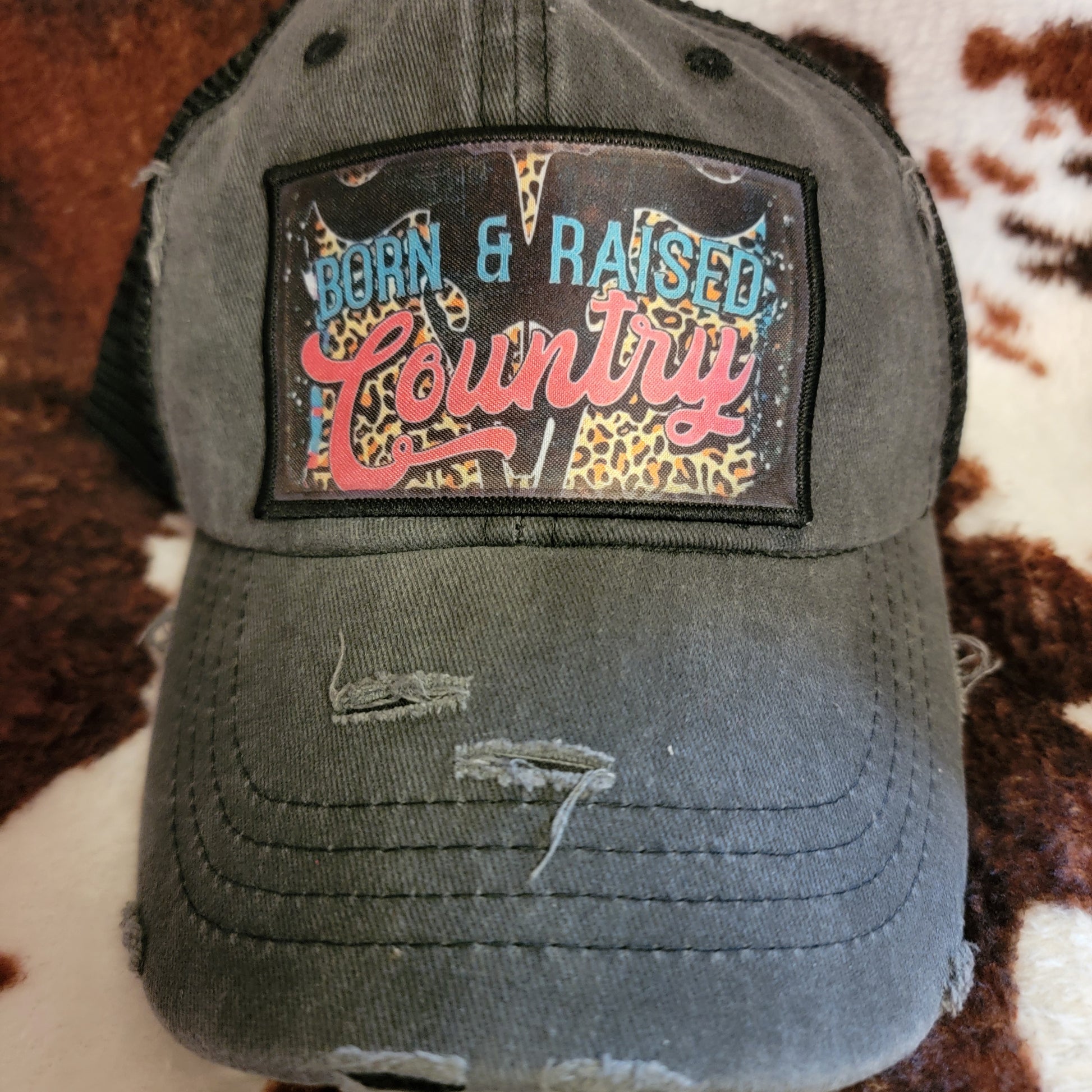 Born Country Bull Skull Distressed Patch Ponytail Hat