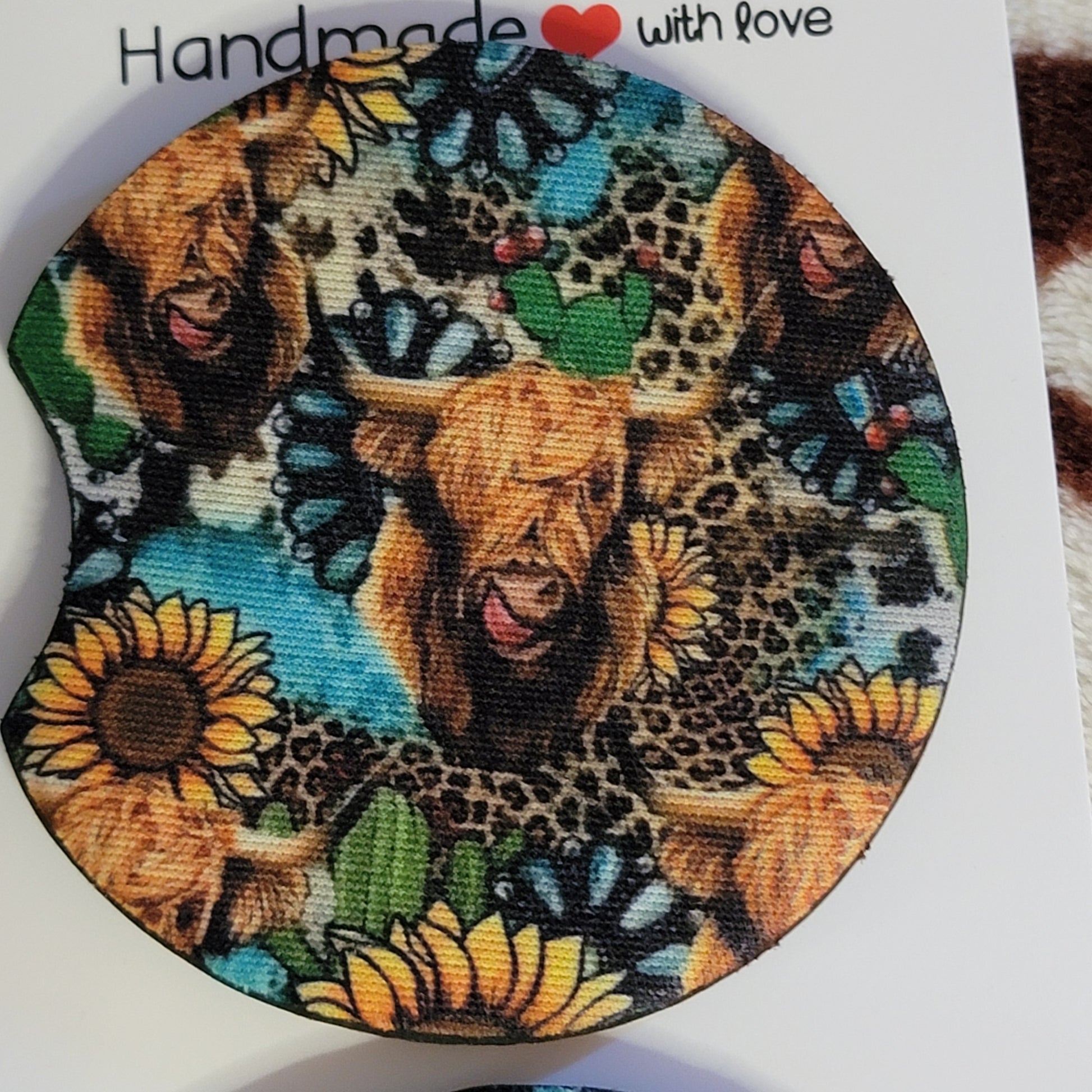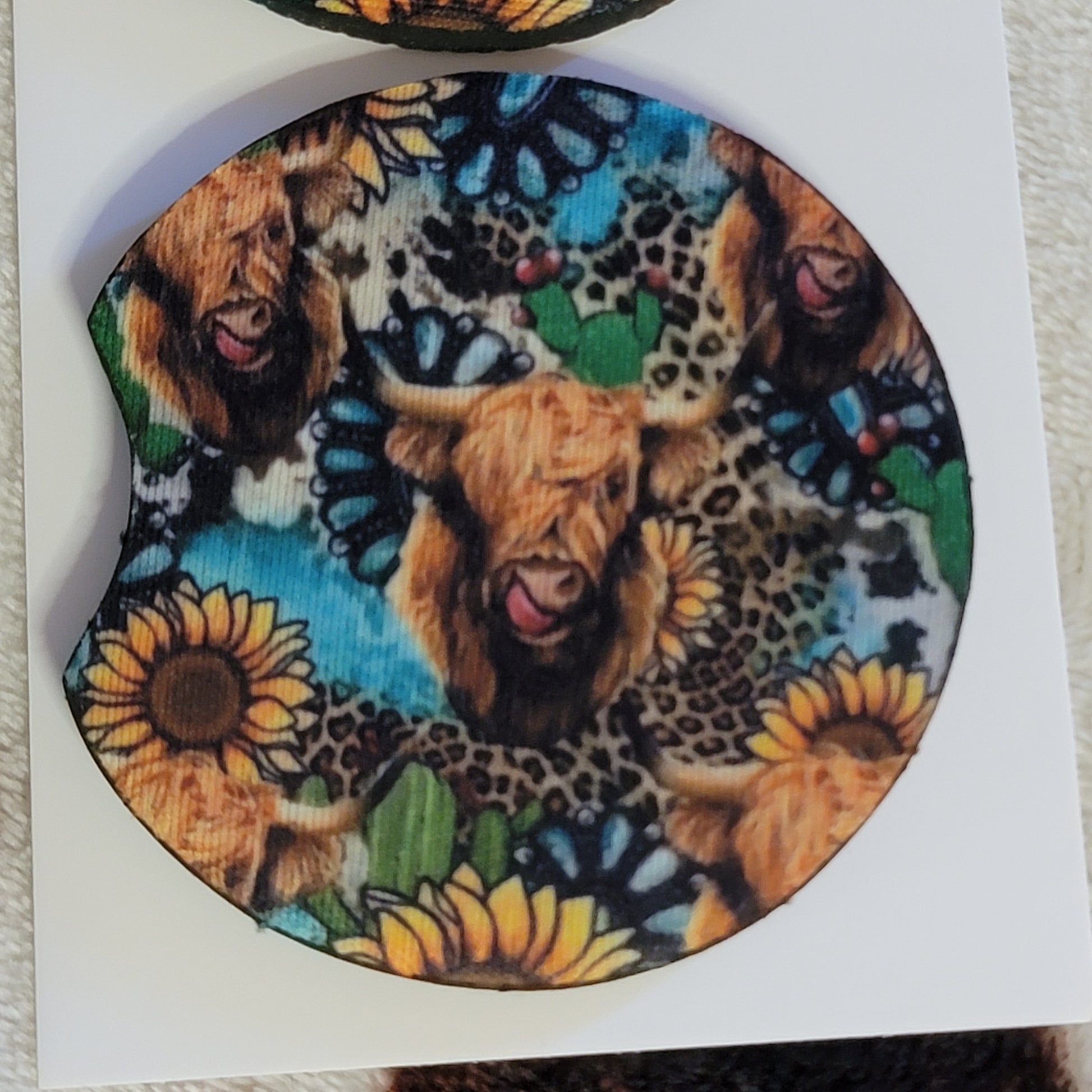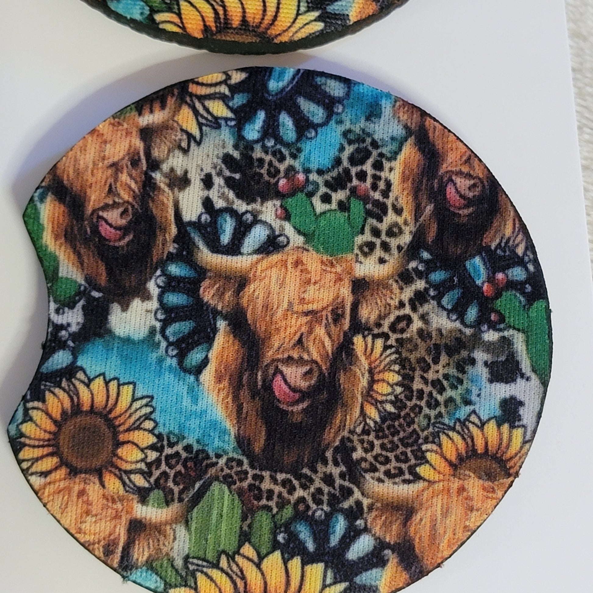 Sunflower Highland Cow Neoprene Car Coaster Set