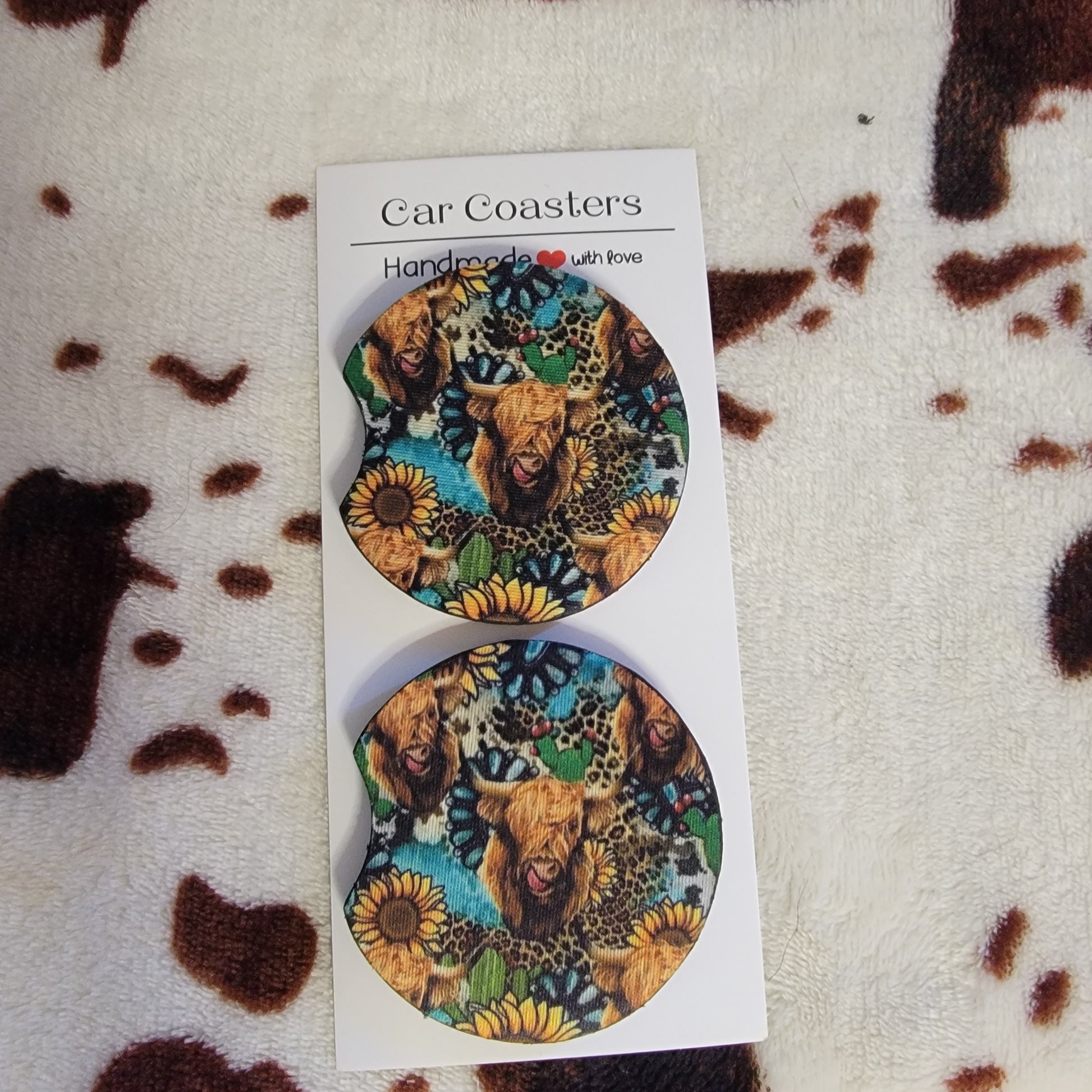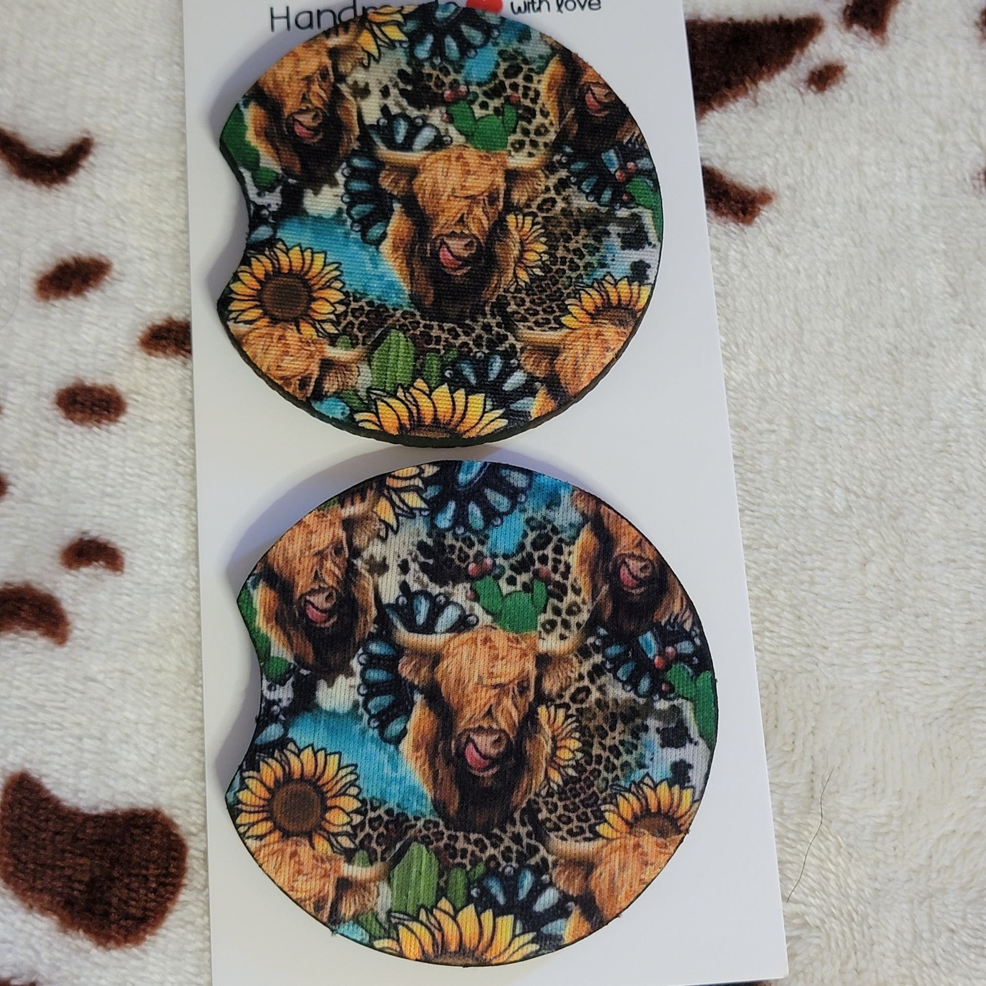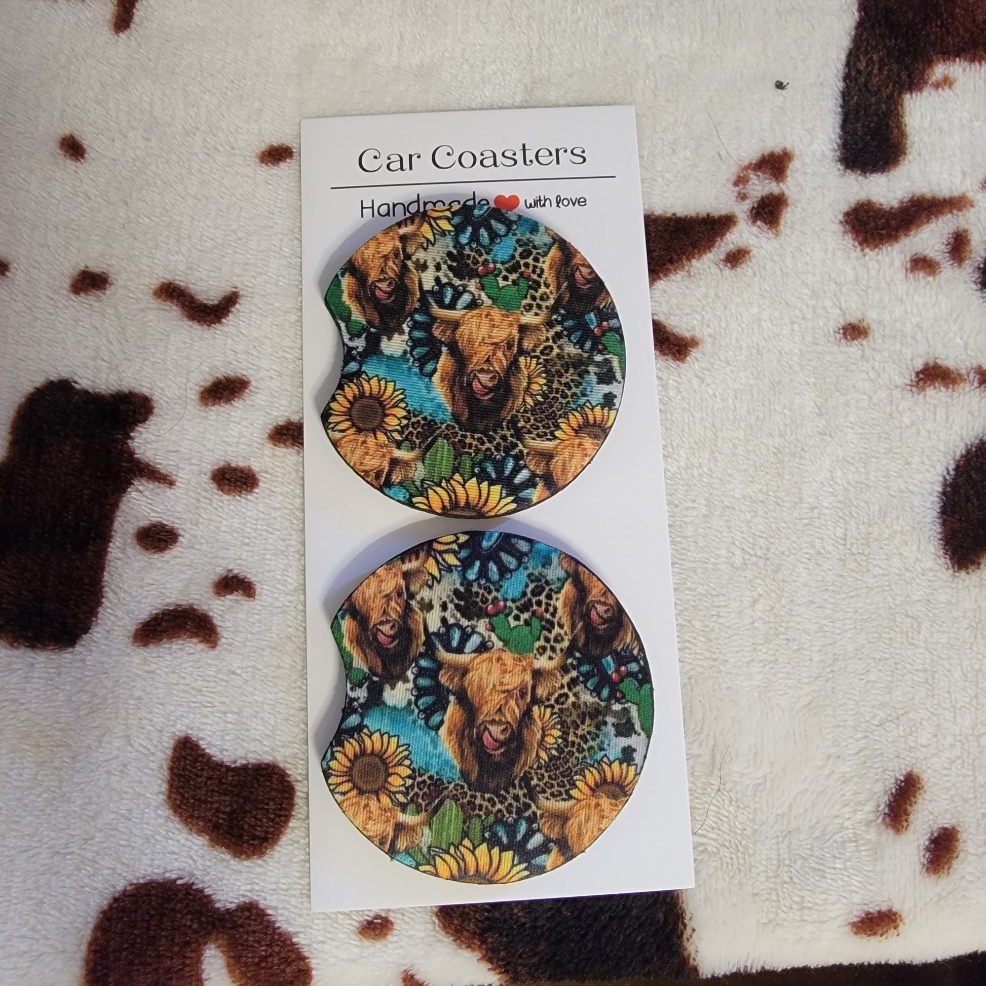 Sunflower Highland Cow Neoprene Car Coaster Set