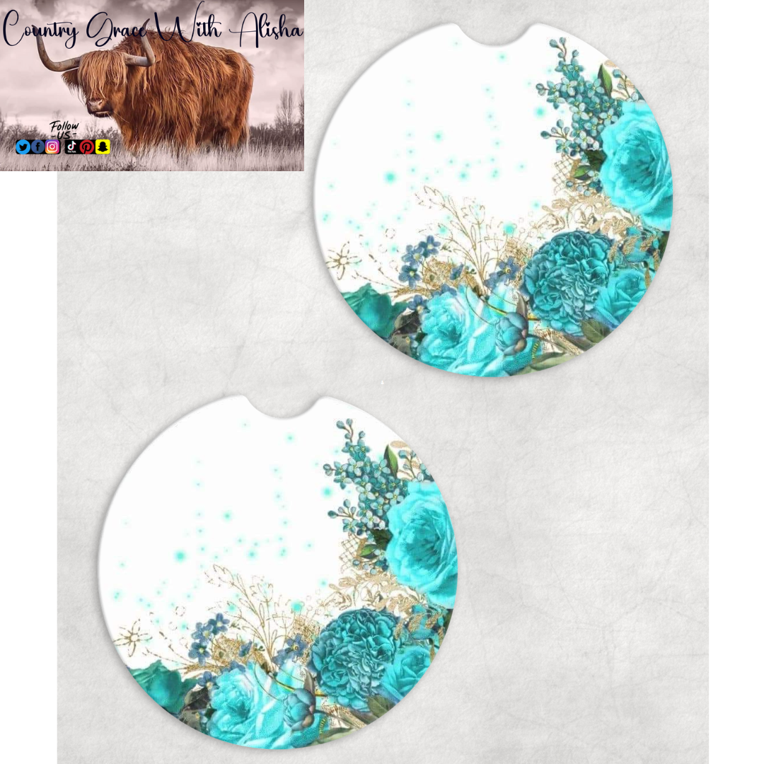 Teal Flowers Neoprene Car Coasters