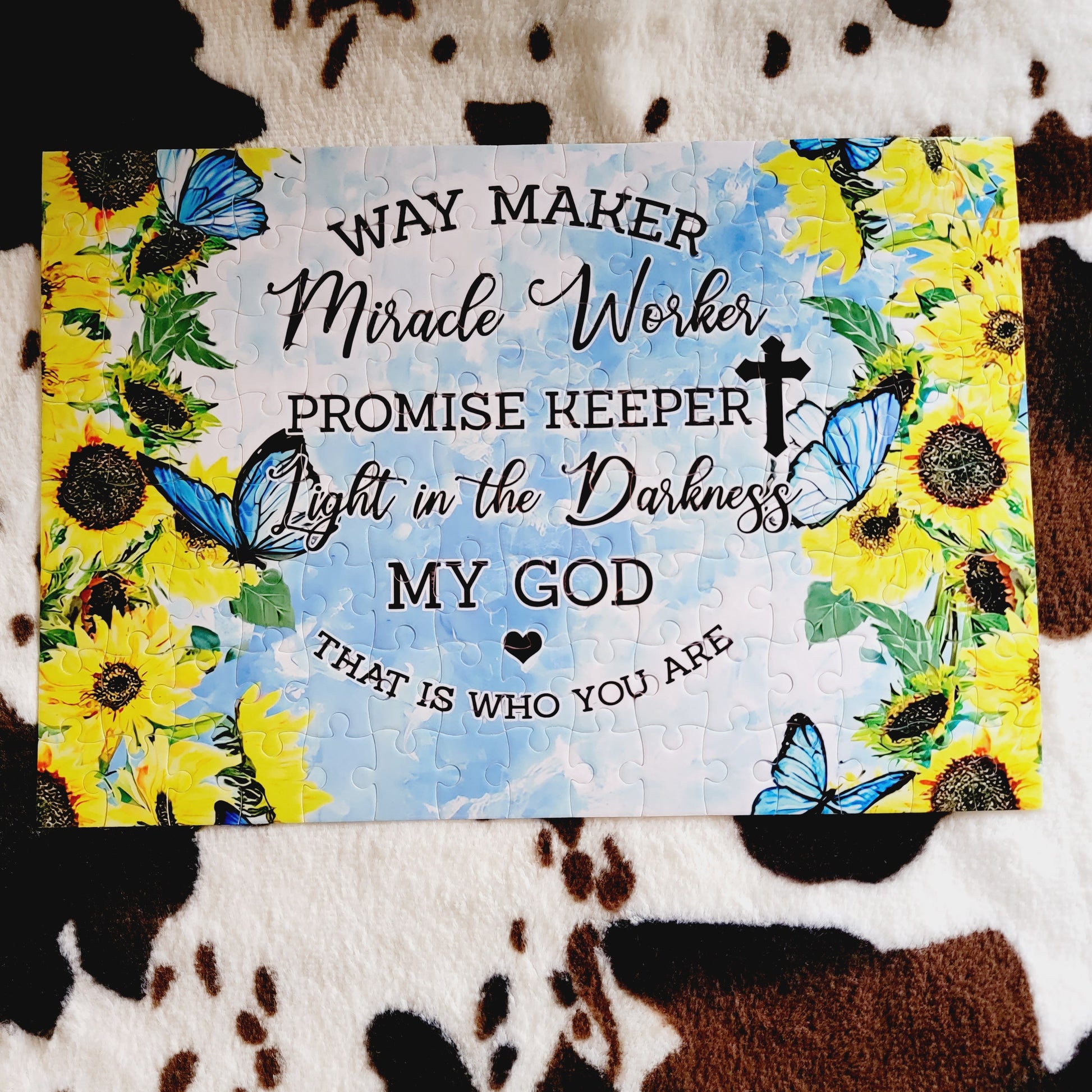 Solve a beautiful Way Maker Butterfly puzzle with 120 individually handmade pieces. The perfect home decor piece, this jigsaw is sublimation printed with vibrant colors that you can enjoy in your free time. Challenge yourself and relax!